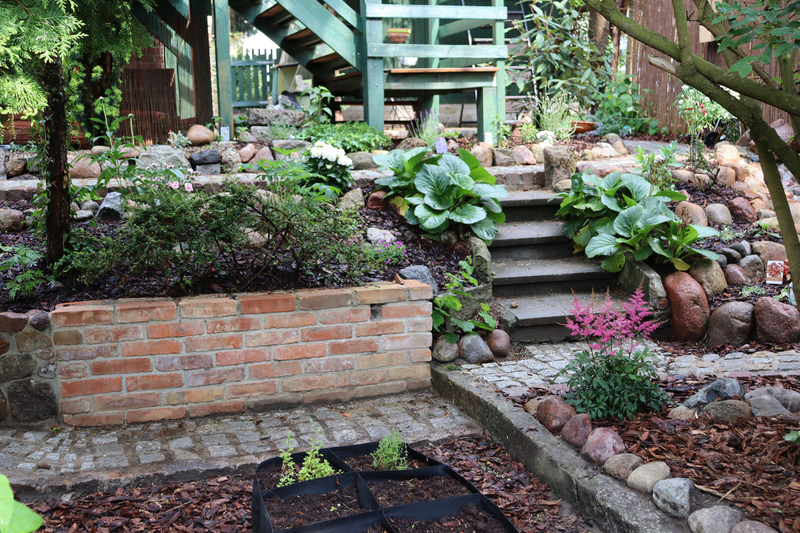 Po wykonaniu głównych alejek, rozpoczęliśmy pracę nad murkami oporowymi i ostatnią alejką prowadzącą na najniższy poziom ogrodu. Ukryte murki oporowe wybudowaliśmy z bloczków fundamentowych na dobrej podbudowie co ustabilizowało skarpy i dało możliwość budowy ścieżki, skarp i miejsca na mikro trawniczek. Solidny fundament wykonaliśmy pod mur z kamienia i cegły, aby zapewnić odpowiednią podstawę. Do budowy użyliśmy kamienia polnego i cegły rozbiórkowej, by nadać klimatu pradawnych czasów.