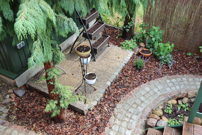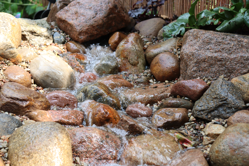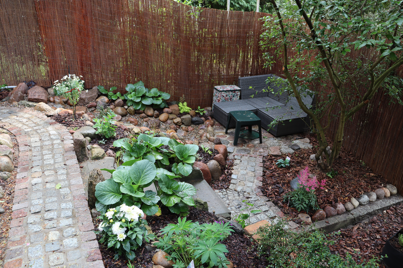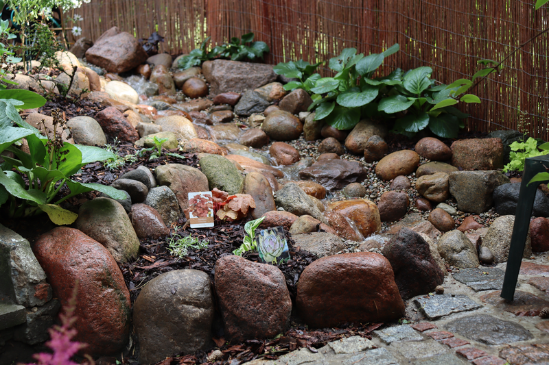Na deser prac, wybudowaliśmy kaskadę wodną, zasilaną wodą z zbiornika na deszczówkę, który ukryliśmy pod miejscem wypoczynku i zadumy. W zbiorniku są dwie pompy, jedna do zasilania kaskady o wydajności 16 000 l/h , druga do zasilania węża ogrodowego. Obie pompy uruchamiane, gdy są potrzebne. Zbiornik na wodę jest usztywniony betonowymi ścianami i wiekiem, na którym znajduje się kamienny taras wypoczynkowy. Nadmiar wody ze zbiornika odsącza się systemem drenażowym na dolną część ogrodu. Drobne prace kontynuowane są co miesiąc.