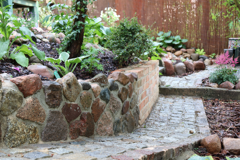 Po wykonaniu głównych alejek, rozpoczęliśmy pracę nad murkami oporowymi i ostatnią alejką prowadzącą na najniższy poziom ogrodu. Ukryte murki oporowe wybudowaliśmy z bloczków fundamentowych na dobrej podbudowie co ustabilizowało skarpy i dało możliwość budowy ścieżki, skarp i miejsca na mikro trawniczek. Solidny fundament wykonaliśmy pod mur z kamienia i cegły, aby zapewnić odpowiednią podstawę. Do budowy użyliśmy kamienia polnego i cegły rozbiórkowej, by nadać klimatu pradawnych czasów.